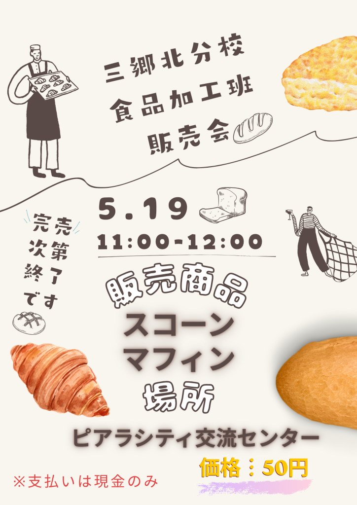 【三郷北分校 食品加工班 販売会のお知らせ】 お知らせ 2026.04.29 ◆日時:5月19日(火) 11:00~12:00(完売次第終了) ◆会場:ピアラシティ交流センター 体験学習室B 手作りスコーン、マフィンで、皆様のご来場をお待ちしております。 古い記事 新しい記事